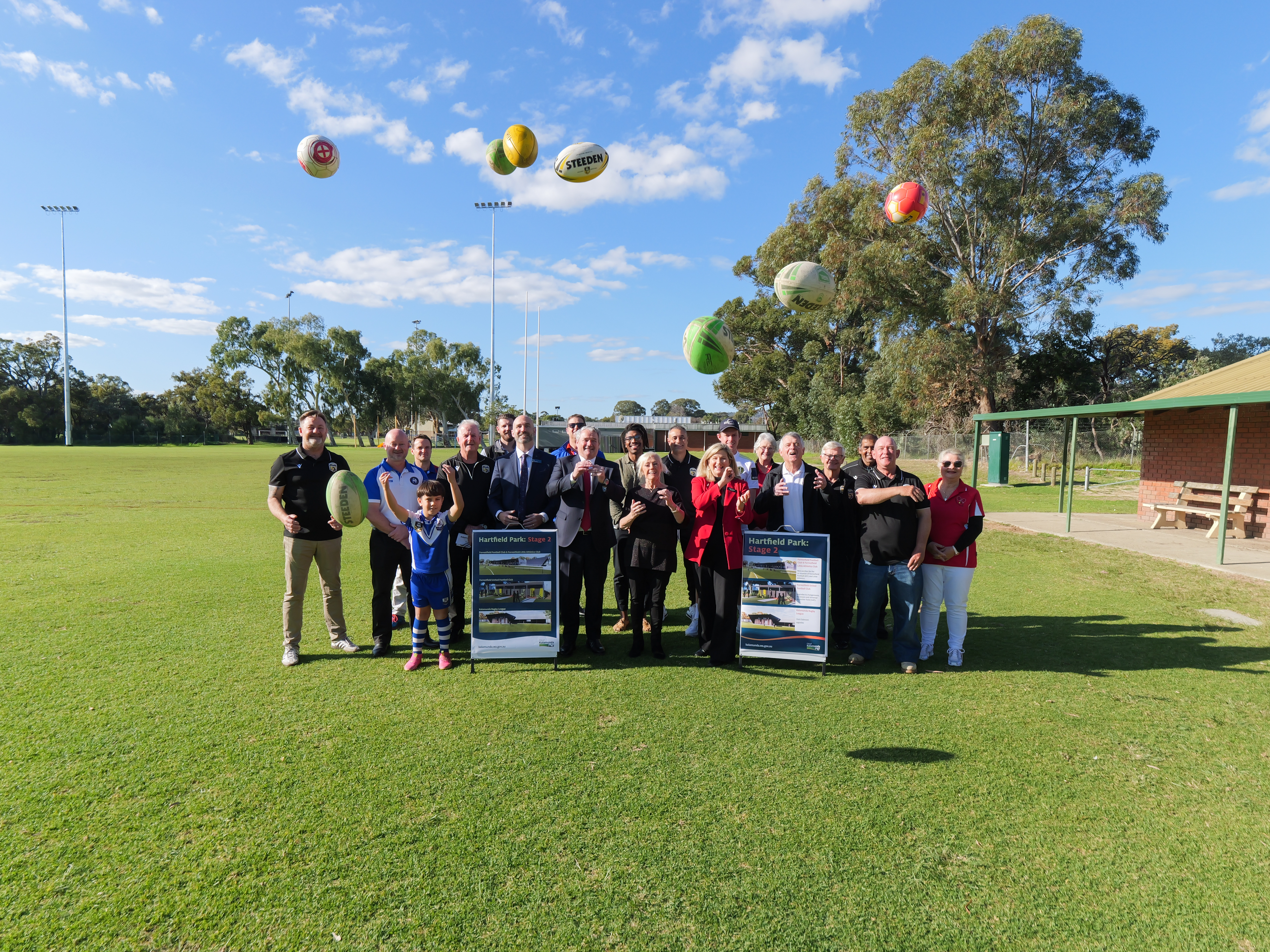 Instead of turning the sod, Federal Member for Bullwinkel Trish Cook MP, State Member for Forrestfield Hon. Stephen Price MLA, City of Kalamunda Mayor Margaret Thomas, and club representatives kicked footballs, threw rugby balls, launched a discus, and dribbled soccer balls.