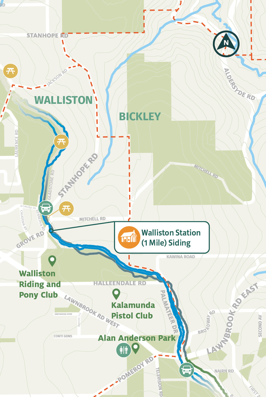 Along this trail you will pass the location of the former Gooseberry Hill Siding, Kalamunda Station, South Kalamunda Siding (Guppy’s Siding), the Walliston Station (1 Mile Siding) and Green’s Landing.